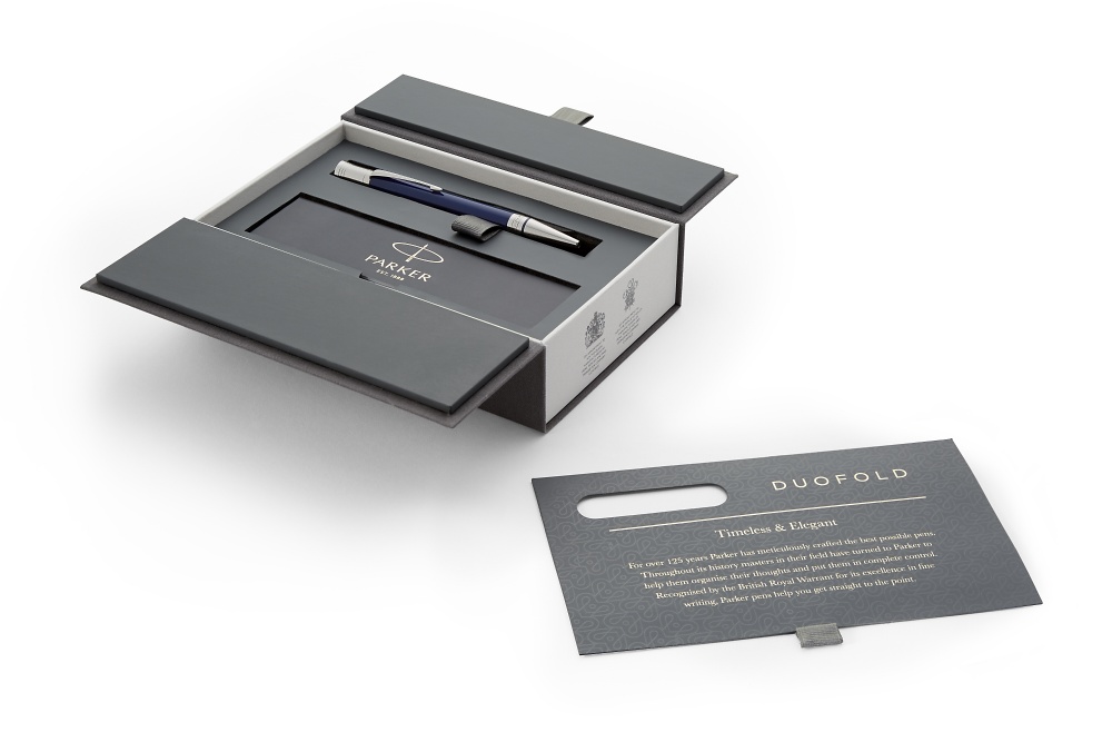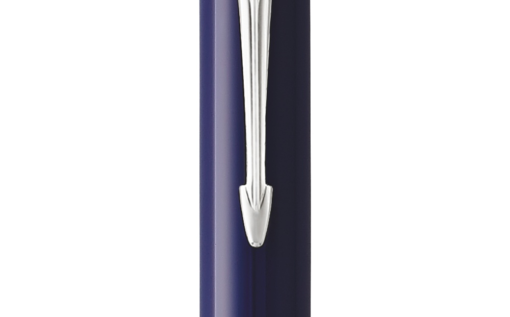 Шариковая ручка Duofold K74 с поворотным механизмом. Клип выполнен в виде стрелы, сделан из бериллиевой меди покрытой никеле-полладием. Эмблема на торце ручки из латуни с гравировкой со знаком туза. На корпусе из акриловой смолы синего цвета гравировка с исторической лентой Parker. Кольцо корпуса и зона захвата из латуни с никеле-полладиевым покрытием. Фирменная упаковка Parker, на боковой стороне коробки нарисованы гербы - подтверждение гарантии Британского Королевского двора. Сделано во Франции.