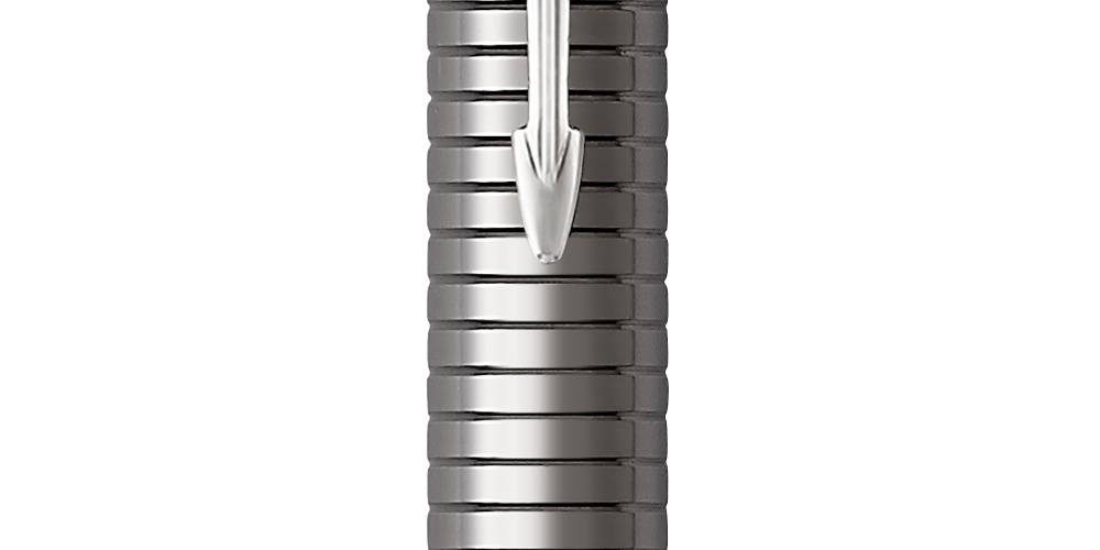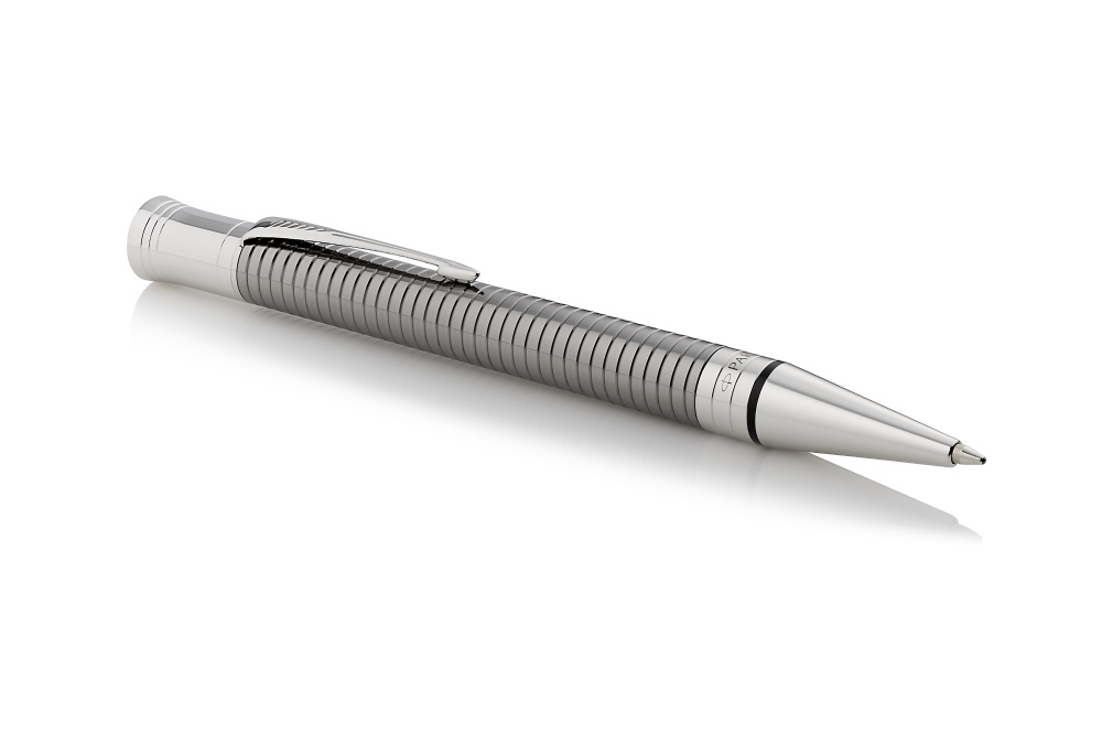 Шариковая ручка Duofold K308 Prestige с поворотным механизмом. Клип выполнен в виде стрелы, сделан из бериллиевой меди покрытой никеле-палладием. Корпус из латуни, покрыт рутением с выгравированными тонкими линиями. Эмблема на торце ручки из латуни, покрытой никеле-поладием, с гравировкой со знаком туза. Широкое кольцо на корпусе из трех соединенных вместе колец, на среднем из которых выполнена гравировка Parker. Фирменная упаковка Parker, на боковой стороне коробки нарисованы гербы - подтверждение гарантии Британского Королевского двора. Сделано во Франции.