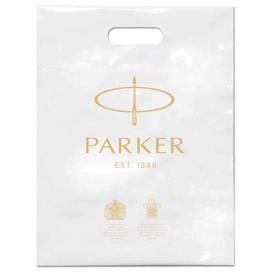белый пакет ПВД, плотный с нанесением логотипа Parker золотом с двух сторон